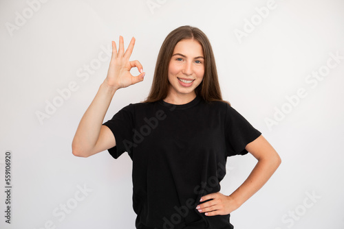 Portrait of happy young woman making okay gesture over white background. Caucasian lady wearing black T-shirt looking at camera and smiling. Success and satisfaction concept