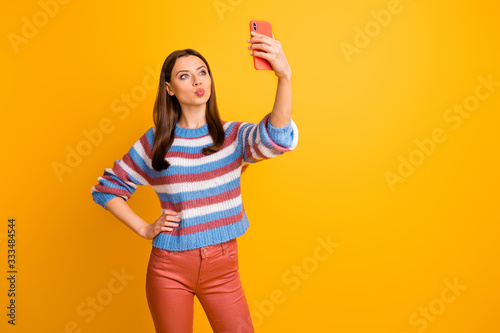 Portrait of her she nice attractive lovely cheerful flirty brown-haired girl traveler tourist taking selfie sending kiss trip travel isolated on bright vivid shine vibrant yellow color background