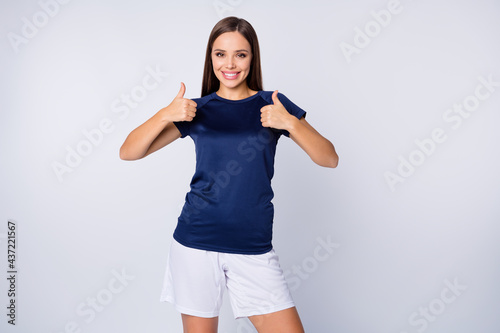 Portrait of her she nice-looking attractive lovely pretty cheerful cheery content straight-haired girl showing thumbup ad advert isolated on light white gray pastel color background