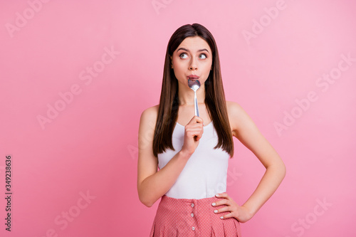 Portrait of her she nice-looking attractive lovely winsome cute pretty dreamy funny shy straight-haired girl licking spoon counting calories isolated over pink pastel color background
