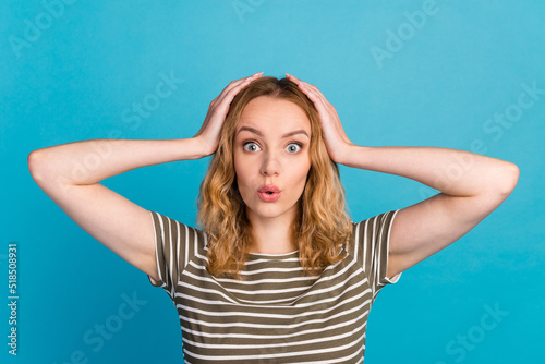 Portrait of impressed lady hands head incredible discount novelty isolated on blue color background