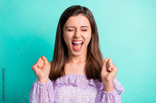 Portrait of impressed nice girl hands fists yell closed eyes wear purple shirt isolated on blue color background