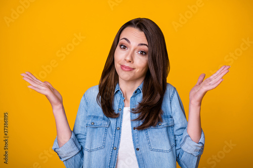 Portrait of indifferent girl dont know answer shrug shoulders wear good look clothes isolated over vibrant color background