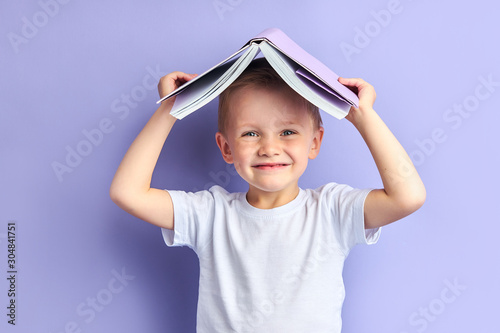 Portrait of joyful caucasian child in casual clothes after education, after reading wants to play. Funny boy holding book above his head, looking at camera