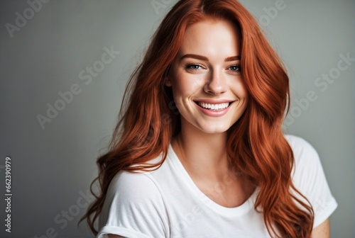 Portrait of Joyful Young Redheaded Woman with Freckles in Fashionable T-Shirt Smiling on White Background