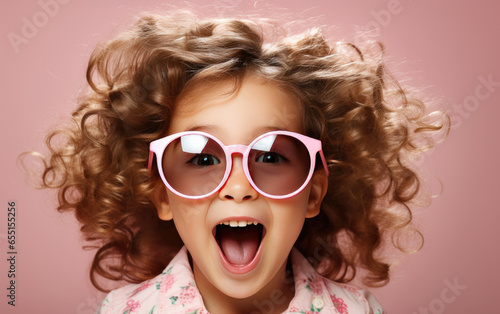 Portrait of kid in solid color clothing, wearing hat and opening mouth, laughing and excited