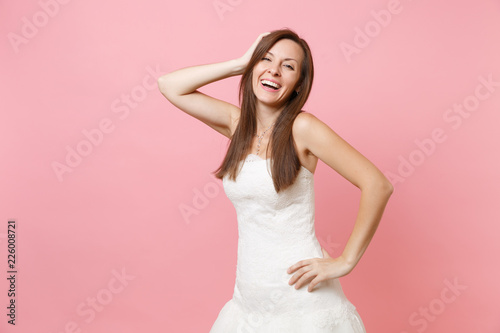 Portrait of laughing bride woman in beautiful white wedding dress standing and keeping hand near head isolated on pink pastel background. Wedding celebration concept. Copy space for advertisement.