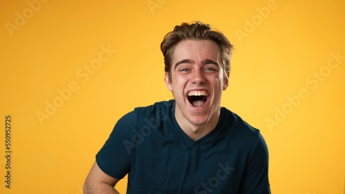 Portrait of laughing smiling happy young hipster man 20s isolated on solid yellow background with copy space in studio