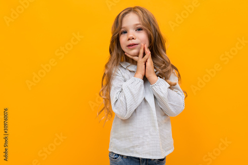 Portrait of little caucasian girl is embrassed isolated on yellow background