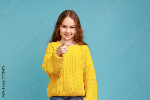 Portrait of little girl looking points finger at camera with smile, choosing you, expressing positive, wearing yellow casual style sweater. Indoor studio shot isolated on blue background.