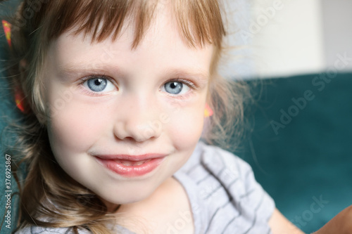 Portrait of little girl with blue eyes and slight smile. Visual examination in children concept
