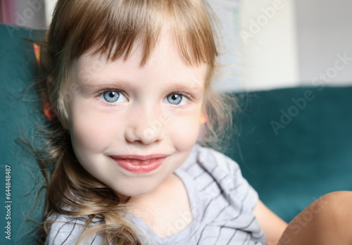 Portrait of little girl with blue eyes and slight smile. Visual examination in children concept