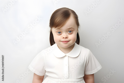Portrait of Little girl with Down syndrome smiling isolated on white background