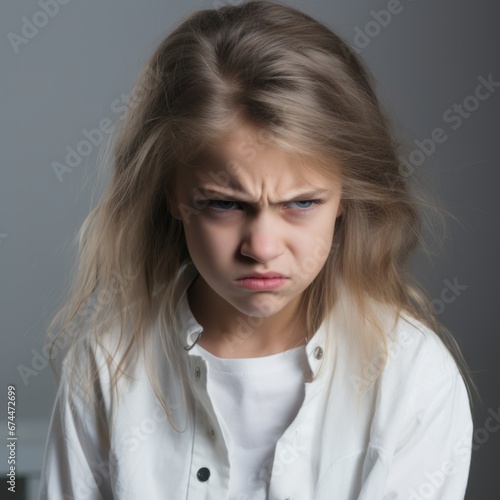 Portrait of little sullen girl frowning eyebrows and looking at camera with dislike. Cute little girl is upset, offended and ready to cry. Beautiful child expresses negative emotion with face and pose