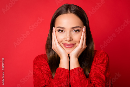 Portrait of lovely girl look in camera with her hands touch cheeks wear sweater isolated over shine red color background