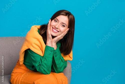Portrait of lovely nice person sit chair beaming smile arms touch cheekbones isolated on blue color background