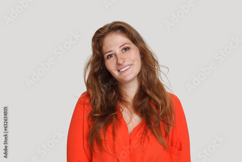 Portrait of lovely redhead woman smiling and looking at camera on white background