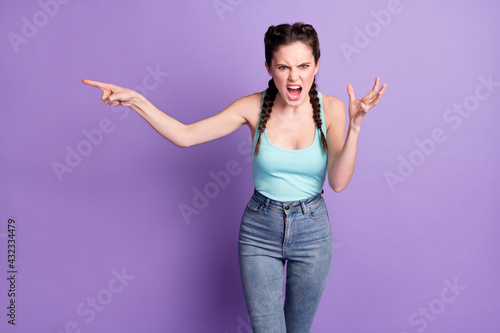Portrait of mad furious crazy girl shouting loudly isolated over violet purple color background