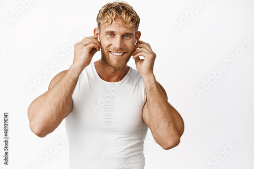 Portrait of male athlete listening music in wireless headphones and smiling, doing workout in gym. Sportsman during exercises, white background