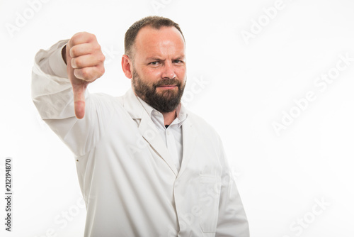 Portrait of male doctor showing thumb down gesture