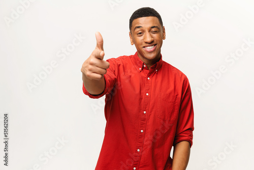 Portrait of man wearing red casual style shirt, pointing finger pistols to camera playfully and flirting, choosing lucky winner. Indoor studio shot isolated on white background