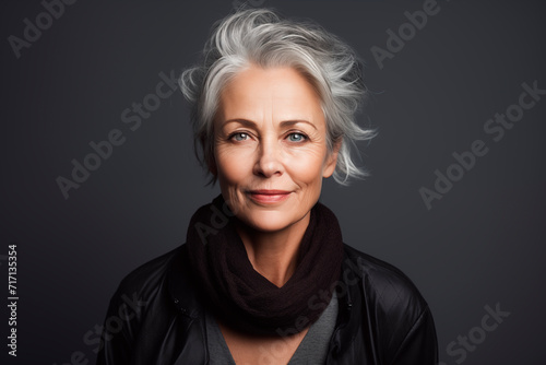 Portrait of mature woman with gray hair and black attire, exuding confidence and elegance.