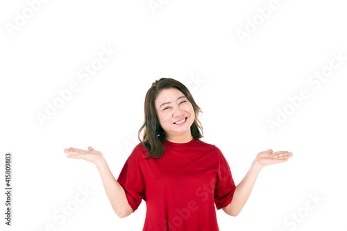 Portrait of middle age 40s Asian woman Raise your hands to both shoulder level. Isolated on white background
