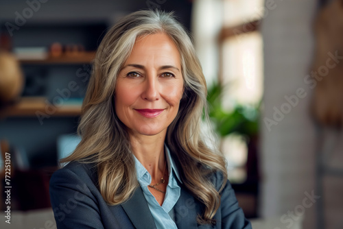 Portrait of middle aged happy business woman in office, closeup