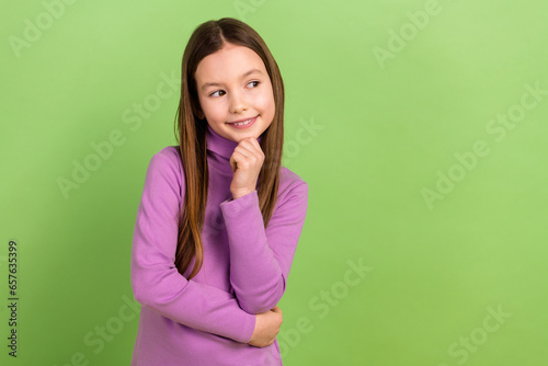 Portrait of minded schoolgirl with long hairstyle dressed violet pullover thoughtfully look empty space isolated on green color background