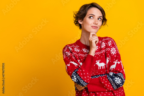 Portrait of minded woman with stylish hairdo wear ornament sweater finger on chin look empty space isolated on yellow color background