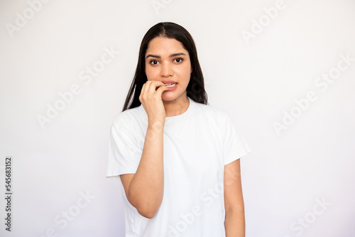 Portrait of nervous young woman biting nails in anxiety over white background. Caucasian lady wearing white T-shirt feeling worried and uneasy. Stress or fear concept