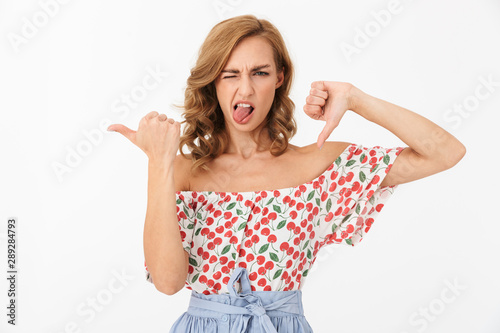 Portrait of nice displeased woman wearing summer clothes grimacing and gesturing thumb down and aside