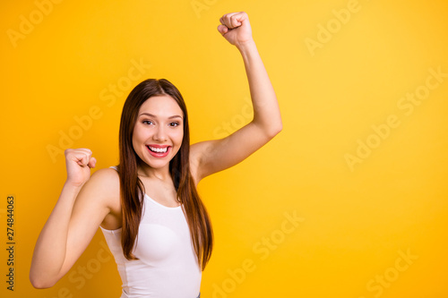 Portrait of nice lovely pretty teen teenager raise fists hands arms she her dressed white light-colored clothing scream shout yeah isolated bright background
