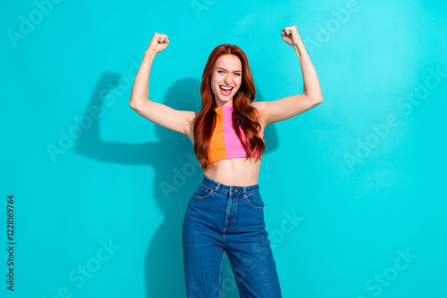Portrait of nice young woman raise fists wear top isolated on bright turquoise color background