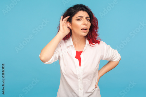 Portrait of nosy hipster woman with fancy red hair in shirt listening attentively holding hand near ear to hear confidential talk, hard to understand. indoor studio shot isolated on blue background