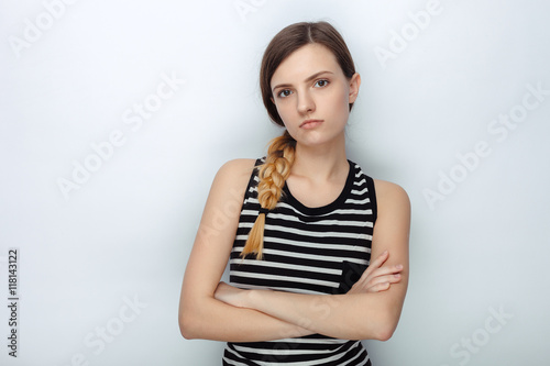 Portrait of offended young beautiful woman in striped shirt posing with crossed arms for model tests against studio background