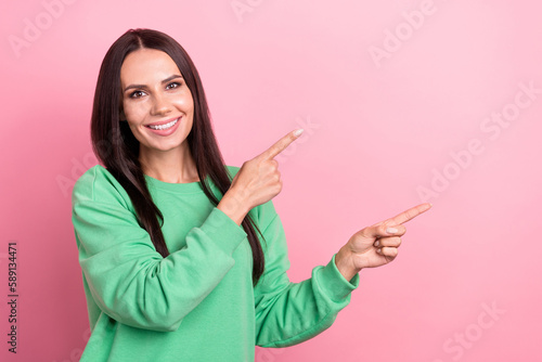 Portrait of optimistic person with long hairstyle wear green pullover indicating empty space offer isolated on pink color background