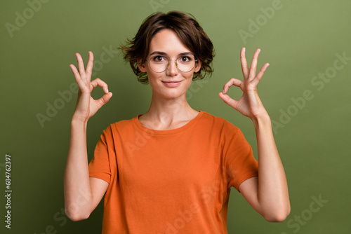Portrait of optimistic woman with bob hairstyle dressed stylish t-shirt in glasses two hands show okey isolated on khaki color background