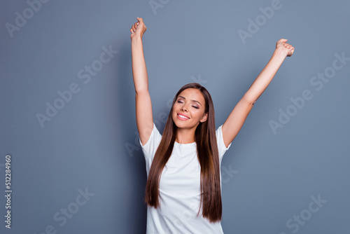 Portrait of peaceful gorgeous girl closed eyes raise stretch arms isolated on grey color background