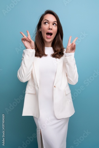 portrait of pensive brunette woman in white dress looking up