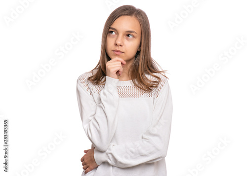 Portrait of pensive teen girl isolated on white background. Thoughtful teenager holding hand near the face, looking seriously away at copy space. Beautiful caucasian confident child student.