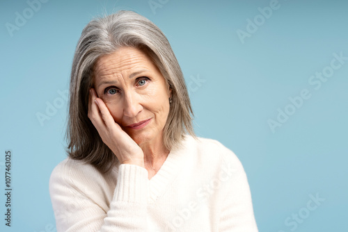 Portrait of pensive, tired, gray haired senior woman looking at camera, copy space
