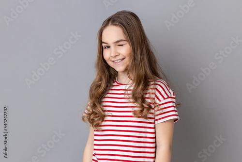 Portrait of playful cheerful little girl wearing striped T-shirt standing and winking playfully, positive expression, looking at camera. Indoor studio shot isolated on gray background.