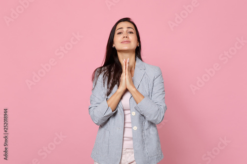 Portrait of pleading young woman in striped jacket holding hands together and praying isolated on pink pastel wall background in studio. People sincere emotions, lifestyle concept. Mock up copy space.