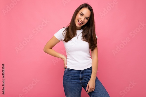 Portrait of positive cheerful fashionable woman in casual t-shirt for mock up isolated on pink background with copy space