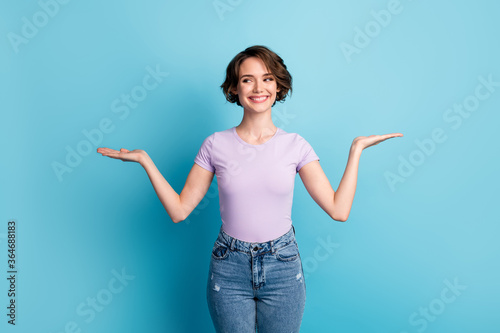 Portrait of positive cheerful girl promoter hold hand demonstrate ads promotion look recommend suggest select product object offer wear violet clothes isolated blue color background
