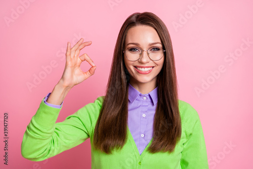 Portrait of positive cheerful girl show okay sign isolated over pastel color background