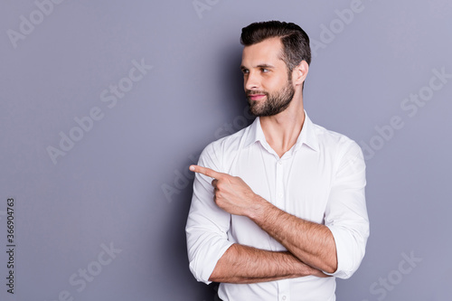 Portrait of positive confident lawyer economist point index finger copyspace indicate ads promotion recommend suggest select wear white shirt isolated over gray color background