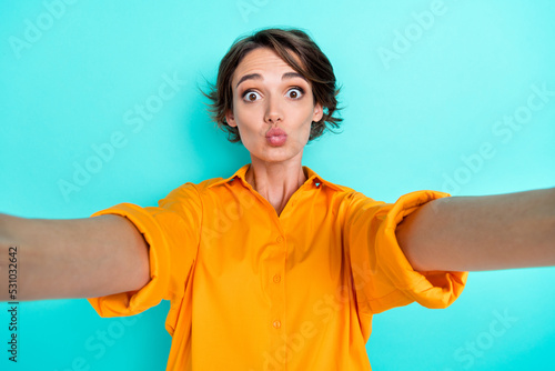Portrait of positive funny lovely girl bob hairstyle dressed yellow blouse making selfie send kiss isolated on turquoise color background