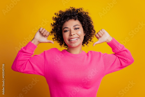 Portrait of positive girl direct fingers thumbs herself yellow color background